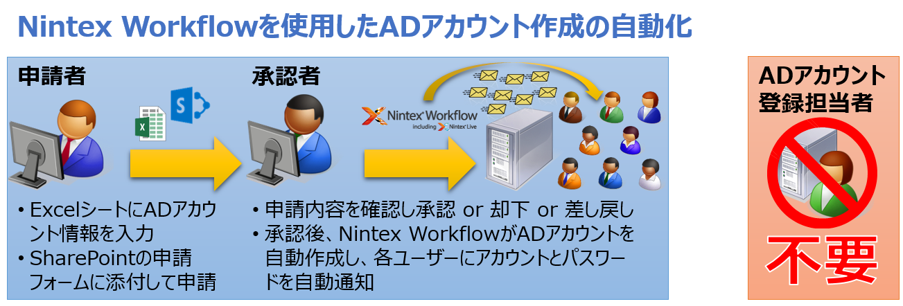 承認者が承認すると、Excelシートに記入されたデータを使って、Nintex Workflowが自動でAD登録してくれる。