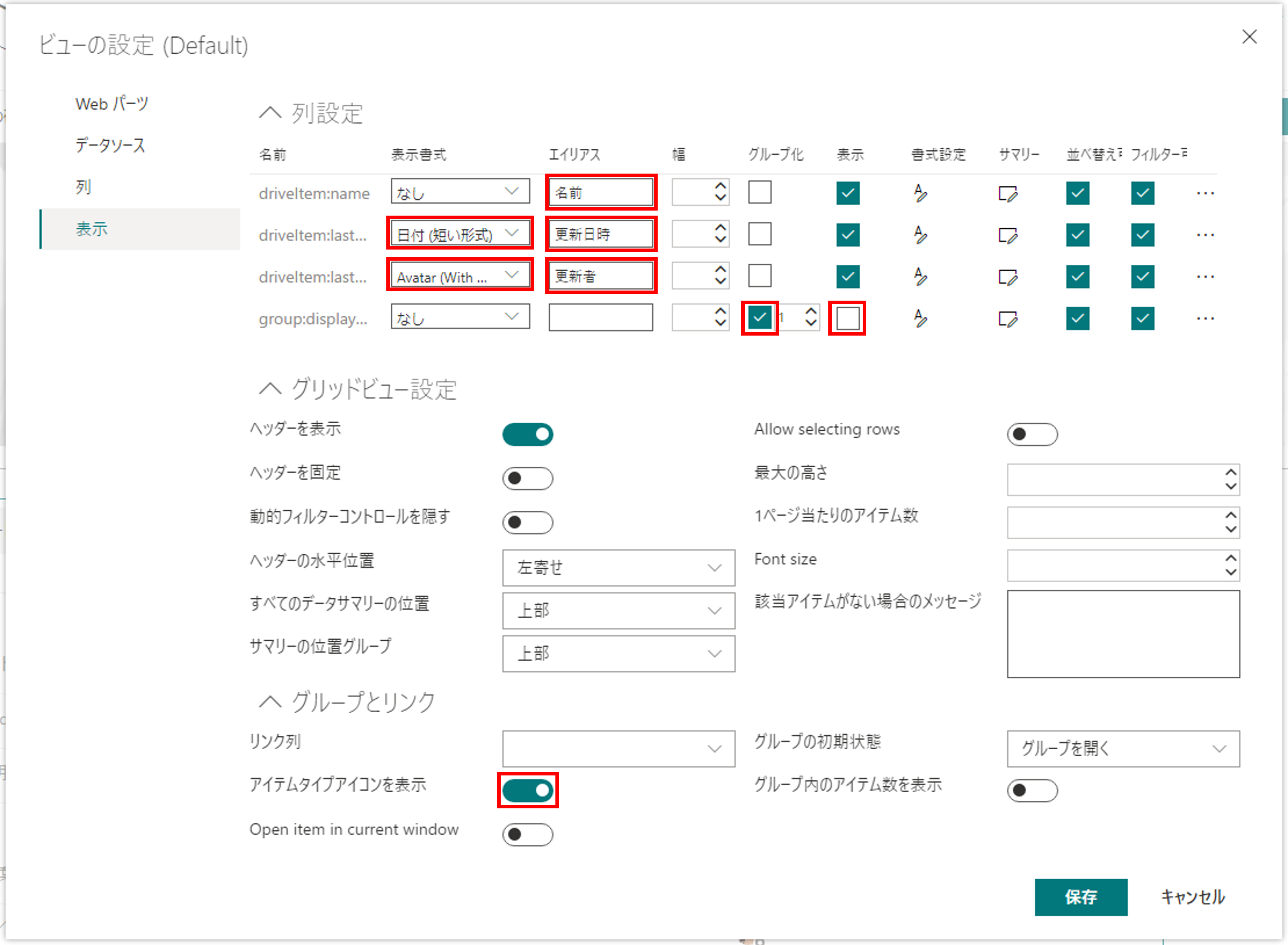 各列について、以下の表示の設定を行う。