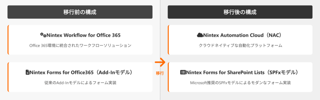 今回ご紹介するのは、”Nintex Workflow for Office 365” および ”Nintex Forms for Office 365(Add-In モデル)” を利用していたシステムに対し、上記の方法から、選択肢①:”Nintex Workflow”(旧名称:Nintex Workflow Cloud/Nintex Automation Cloud)への移行を支援した事例です。