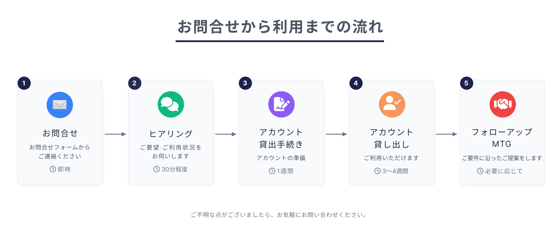 お問い合わせをいただいた後は、以下の流れでご案内を進めさせていただきます。