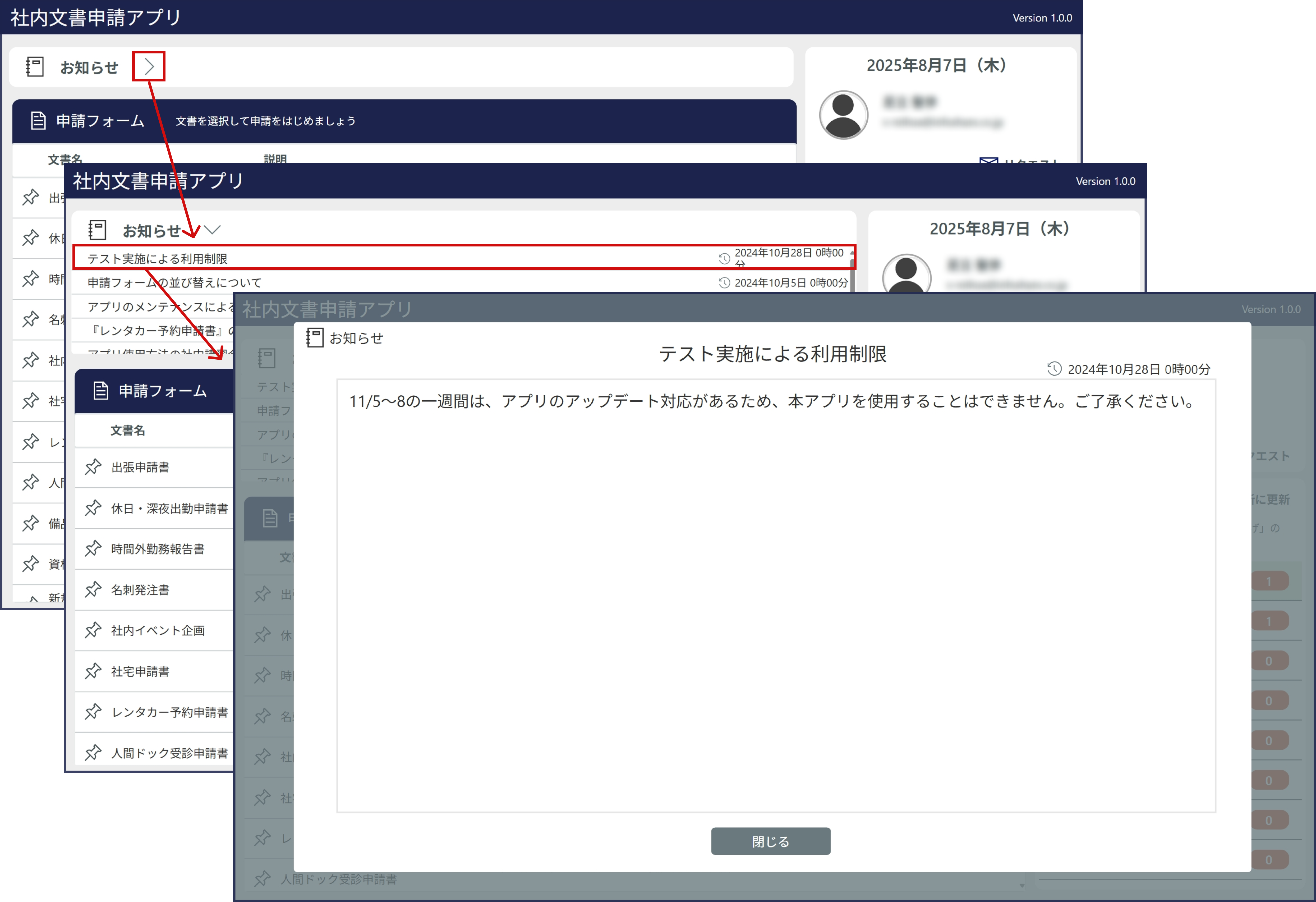 トップ画面にある「お知らせ」の横「>」をクリックすると、管理者用アプリで作成されたお知らせが一覧表示されます。 さらに、任意のお知らせをクリックすることで詳細を確認できます。