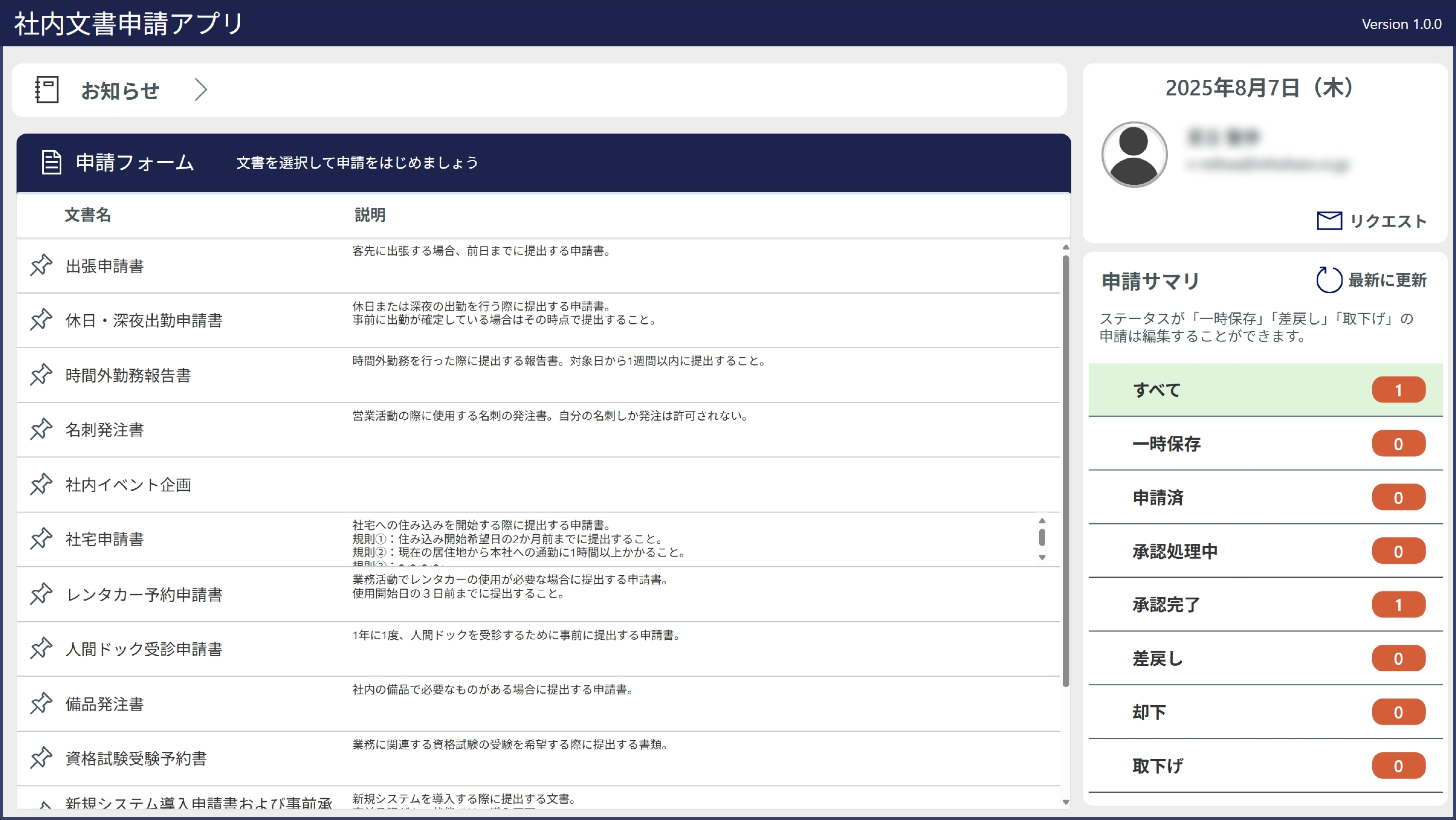 申請者用アプリでは、申請書の提出や承認状況の確認に加え、管理者からのお知らせの閲覧や、管理者へリクエストを送信することができます。以下では、実際の画面を交えながら主な機能をご紹介します。