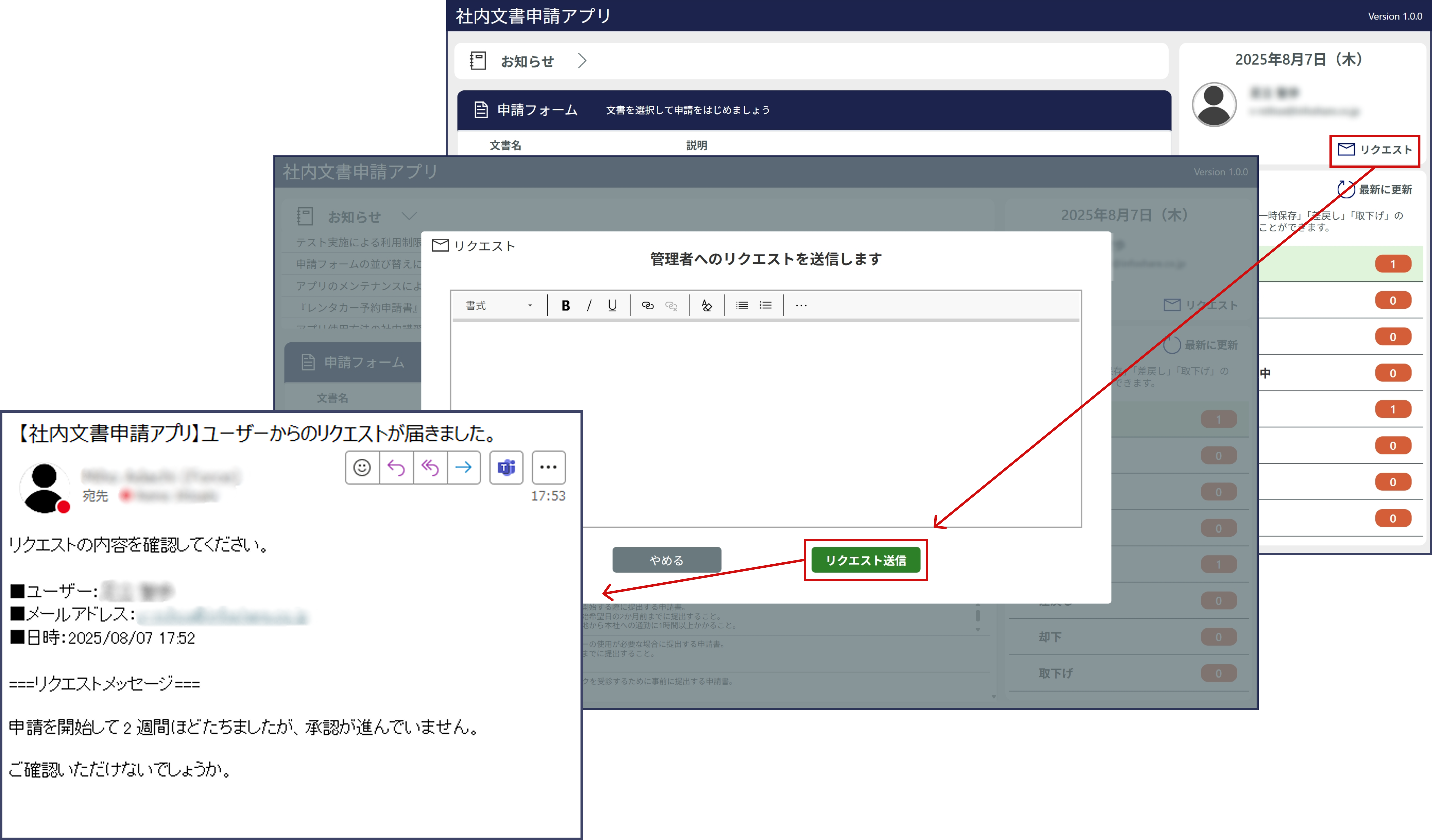 送信されたリクエストは、管理者用アプリに設定されたメールアドレス宛てに通知されます。