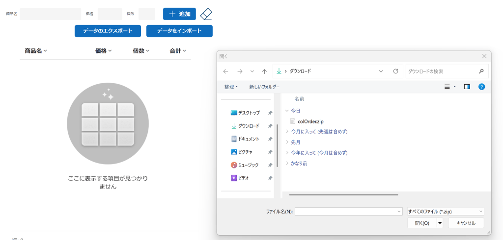エクスポートを実行すると、「data.zip」というファイルはデバイスにダウンロードされます。