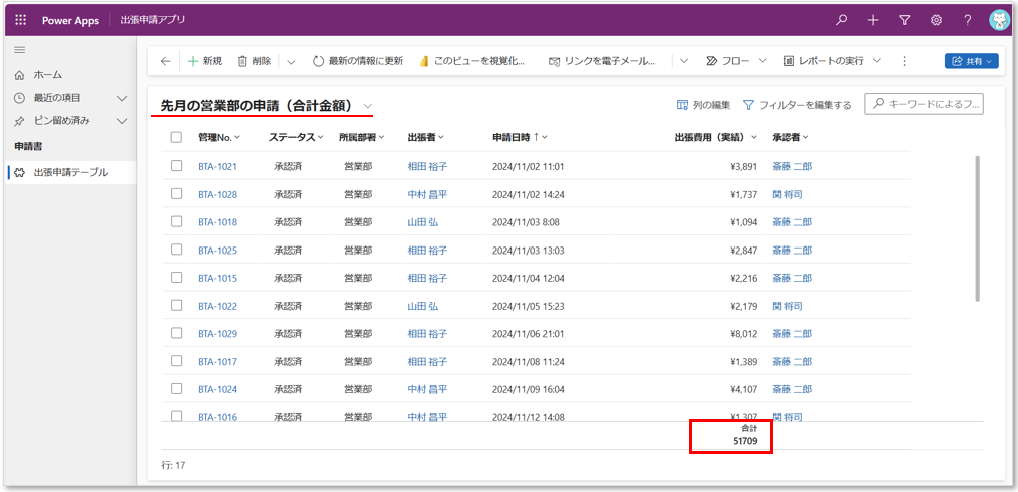Aさんはカスタマイズを行い、新しく「先月の営業部の申請(合計金額)」という個人用ビューを作成しました。合計金額の表示は固定できないので、ビューを開いたら「出張費用(実績)」列の「合計」表示だけを毎回行う必要があります。ただ、その1ステップだけで「5万円」を超えているかどうか簡単に判断できるようになりました。(※ちなみに、フィルター条件の『申請日時が「先月」』は今日の日付に対して動的に動作するので、ビューの毎月更新は不要です)