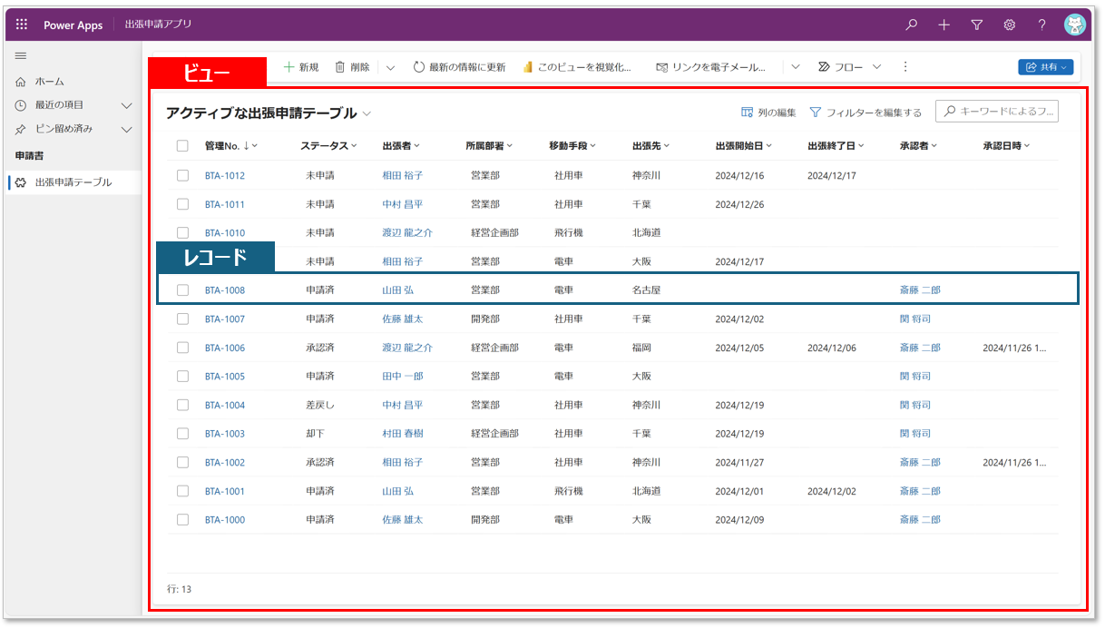 ビューとは、テーブル毎に表示され、テーブル内のレコード(データ)が一覧表示されているパーツです。アプリユーザーがデータを効率的に閲覧、検索、分析することができます。レコードをクリックすると、フォーム形式でデータが開かれ、データの作成や編集を行うことができます。