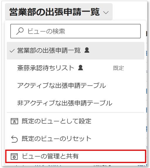 ビューの切り替え画面から「ビューの管理と共有」をクリックします。