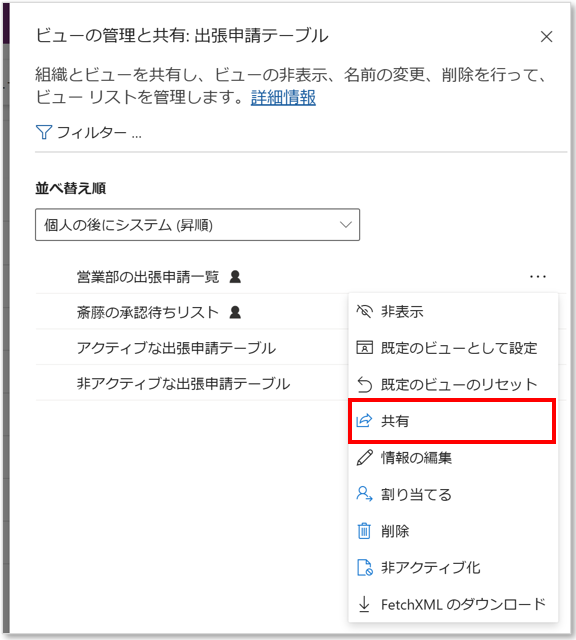他のユーザーに共有したい個人用ビューの「・・・」>「共有」をクリックします。