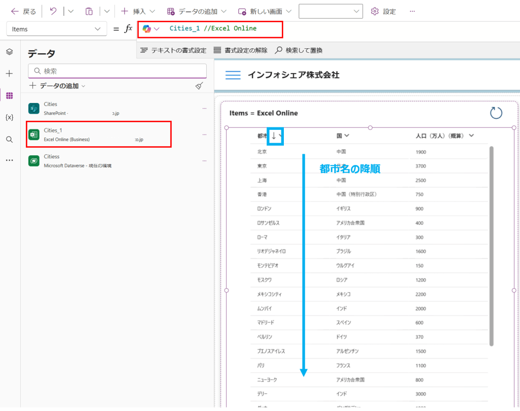 最後にExcel Onlineでも見てみます。都市名の降順にしてみました。