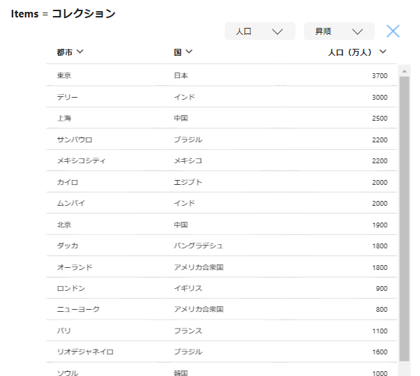 まずはSharePointリスト。人口の昇順で並び替えてみます。