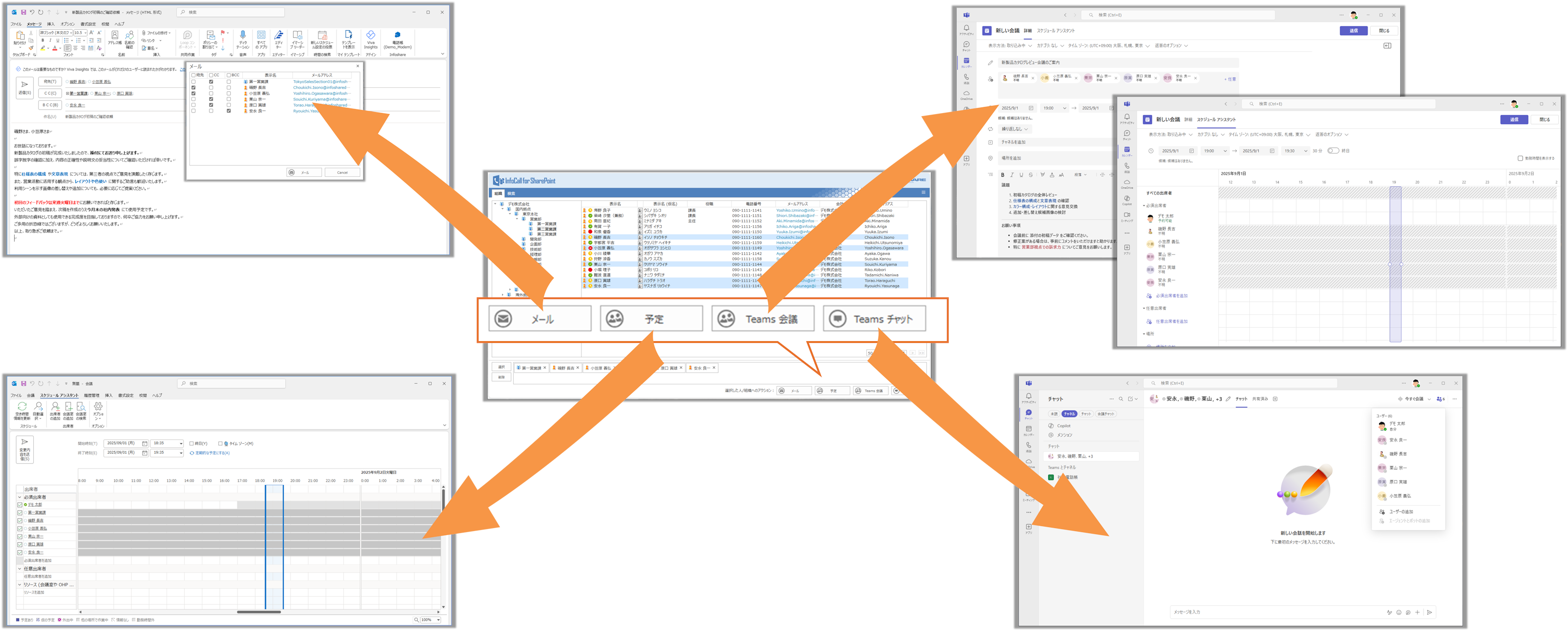 また、Office 365™ はオンラインで、SharePoint はオンラインとオンプレで活用という企業も増えてきていますが、選択した複数のユーザー/組織の情報を元に、「メールを送る」、「ミーティングリクエストを送る」、「インスタントメッセージや音声、ビデオ会議をはじめる」というような様々なアクションを簡単にとることができます。