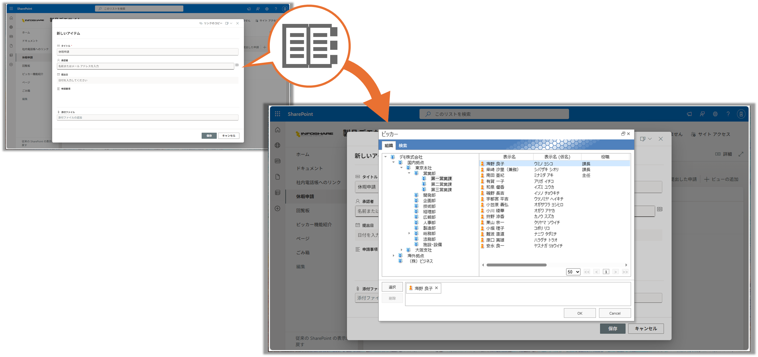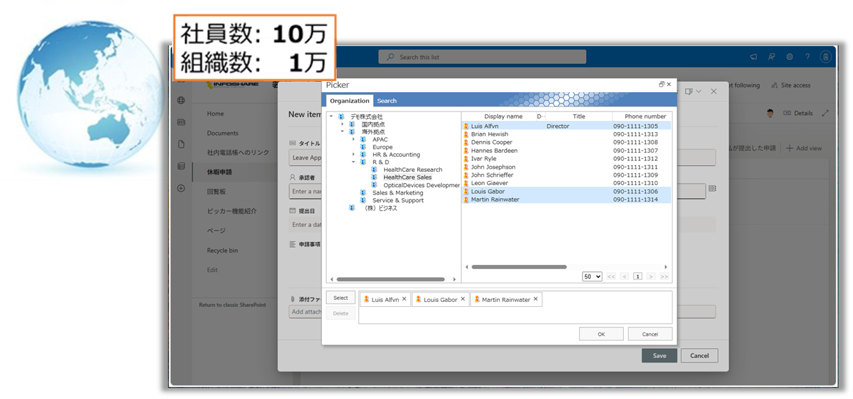 人や組織を選択するUIでも、専用ダイアログを呼び出すことができ、共通の組織情報をつかって、人や組織を探し、選択することが可能です。