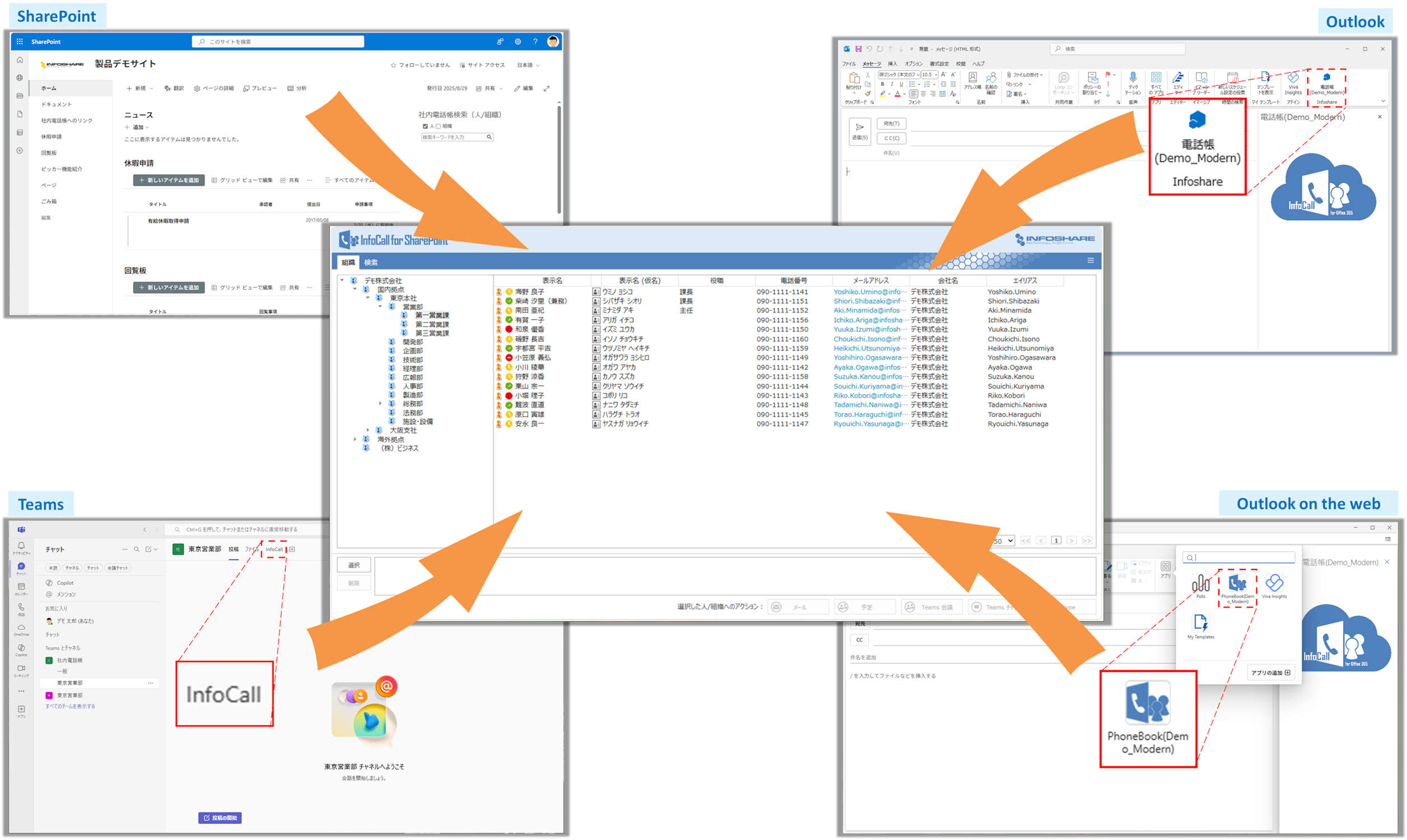 また、SharePoint Online上だけではなく、Outlook 2016/2019/2021、Outlook on the Web、Microsoft Teams といった Office 365 の主要アプリケーションからの呼び出しにも対応しており、複数のアプリケーションで共通の電話帳を様々なシーンで活用することができるようになっています。