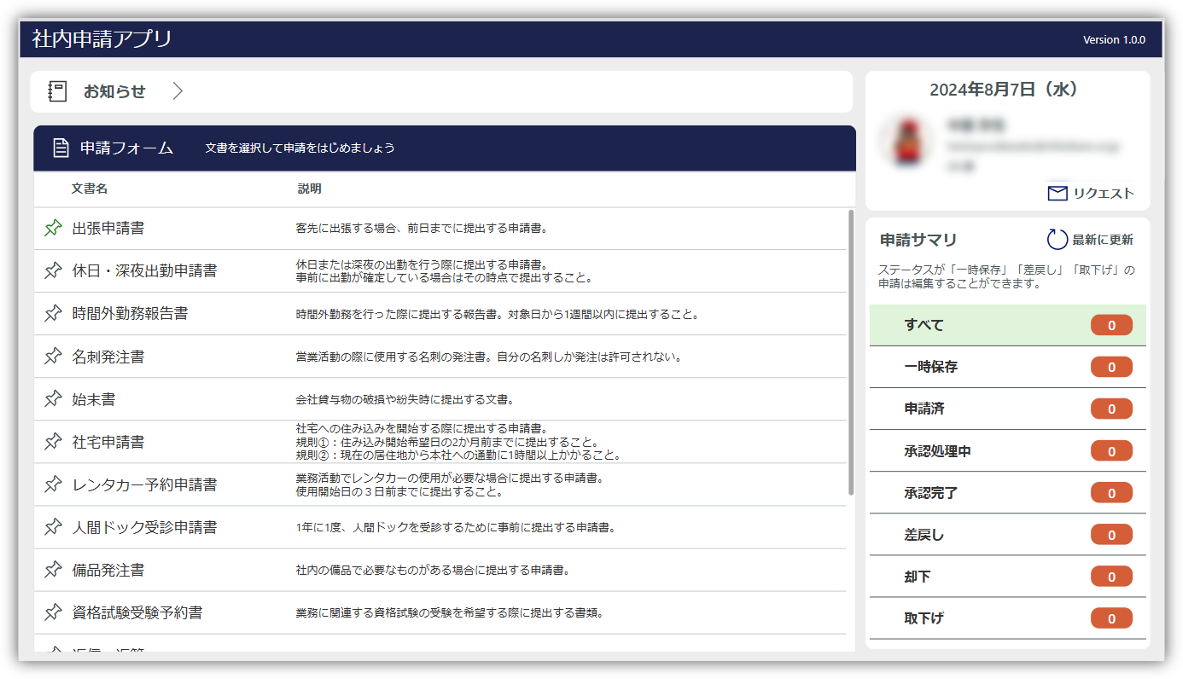 承認者の自動設定や、多段階承認などの機能を含んだ申請・承認アプリケーションを1つのアプリで実装しています。