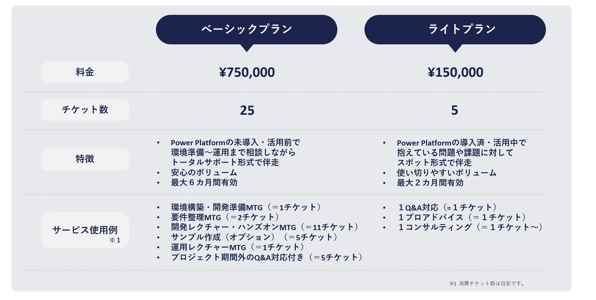 伴走型支援サービスには「ベーシックプラン」と「ライトプラン」の2つのプランがございます。「ベーシックプラン」は、Power Platformの導入がはじめてのお客様におすすめのプランです。アプリのみならず環境の準備や運用のアドバイスなどを一気通貫でサポートいたします。「ベーシックプラン」は既にPower Platformの導入し始めているお客様におすすめのプランです。アプリ開発におけるご相談やプロの視点からのフィードバックなど、必要な分だけスポット形式でサポートいたします。2つのプランの大きな違いは「チケット数」です。1チケット=2時間分の支援となります。ただし、チケットをどのように活用し消費していくかはご希望に合わせながら個別に計画しますのでお気軽にご相談ください。