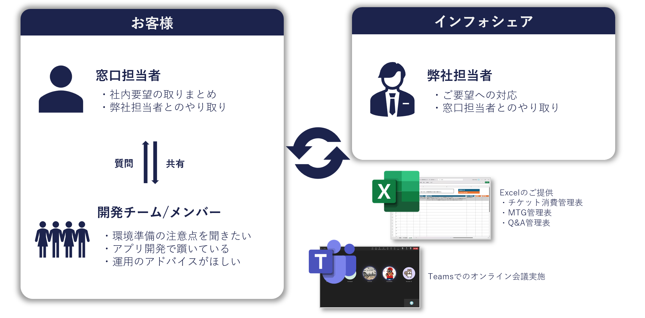 以下の体制図のように、弊社担当者がお客様の窓口担当者と連携しながら進めていきます。チケットという単位でオンライン会議やQ&Aの対応をさせていただき、お客様の手が止まってしまうことがないように伴走してまいります。